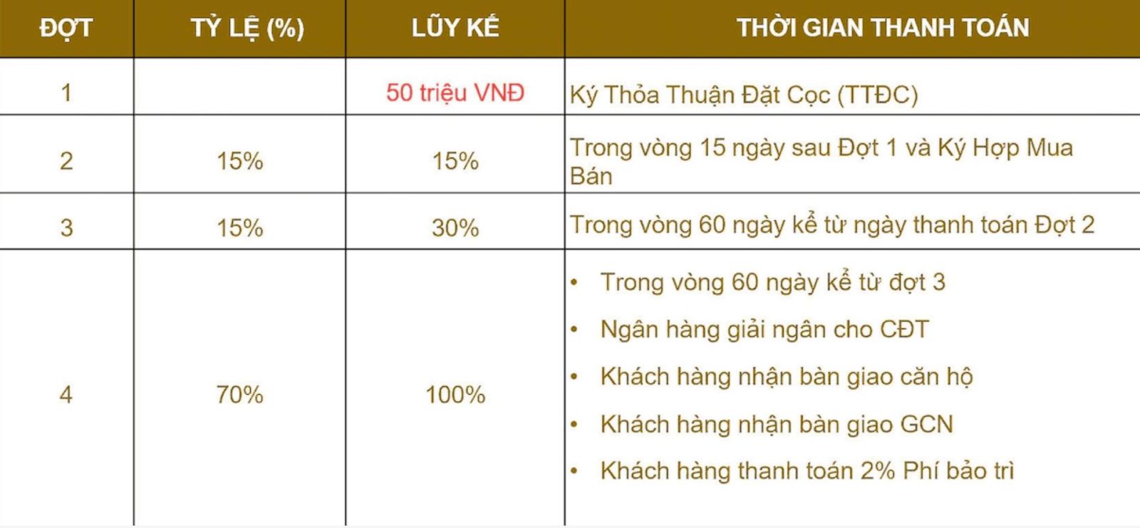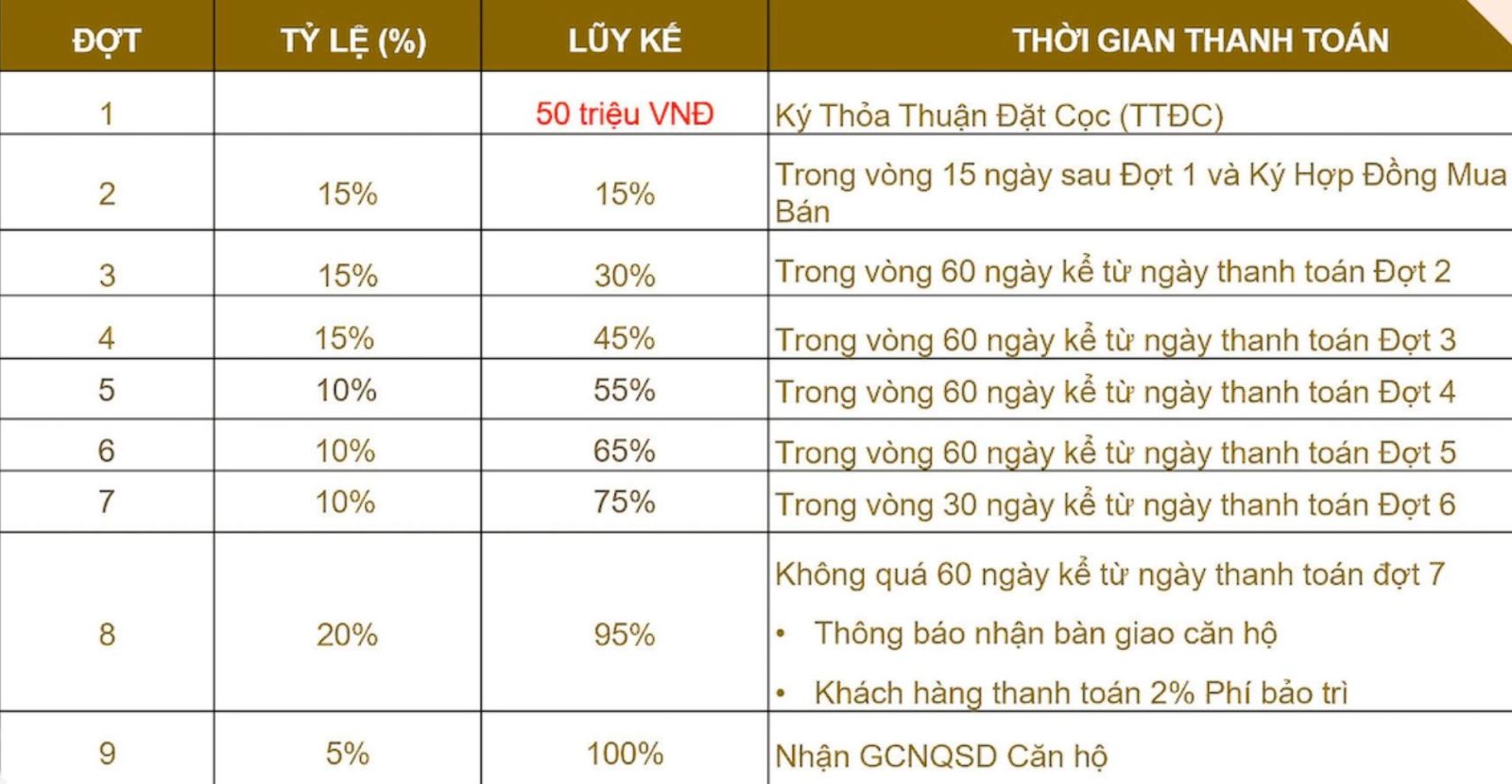 Khách hàng cần đảm bảo thực hiện các khoản thanh toán đúng hạn theo thời gian quy định. Hoàn thành đầy đủ các thủ tục pháp lý cần thiết trước khi nhận bàn giao căn hộ và Giấy Chứng Nhận. Nếu có thắc mắc về tiến độ thanh toán, khách hàng vui lòng liên hệ 0902 796 118 để được hỗ trợ.